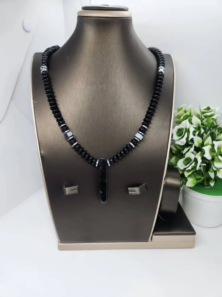 This necklace features a single, streamlined column of premium black beads, meticulously arranged to create a balanced and modern look. Each bead is polished to perfection, offering a smooth finish that catches subtle light — making it perfect for both casual and formal wear.