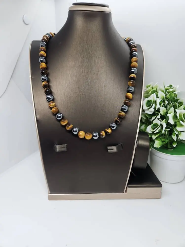 Designed for those who embrace power and balance, this necklace exudes confidence and sophistication. The deep metallic sheen of amatite beads complements the warm tones of tiger beads, creating a striking contrast that suits both modern and traditional styles.