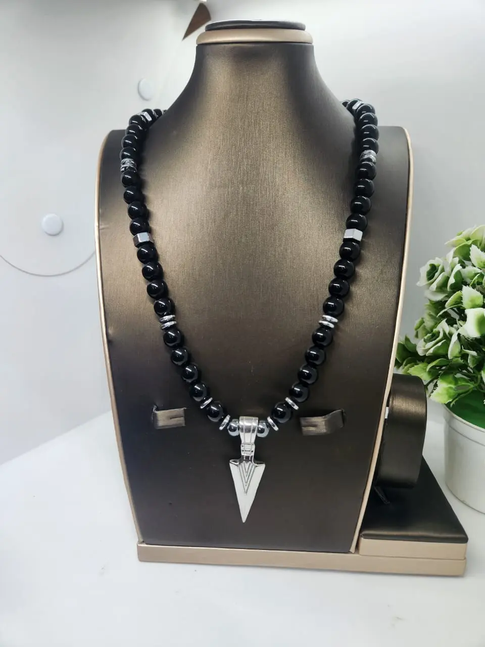 This necklace features smooth premium black beads strung together to create a balanced, powerful look, paired with a striking spearhead pendant — a symbol of protection, precision, and warrior spirit.